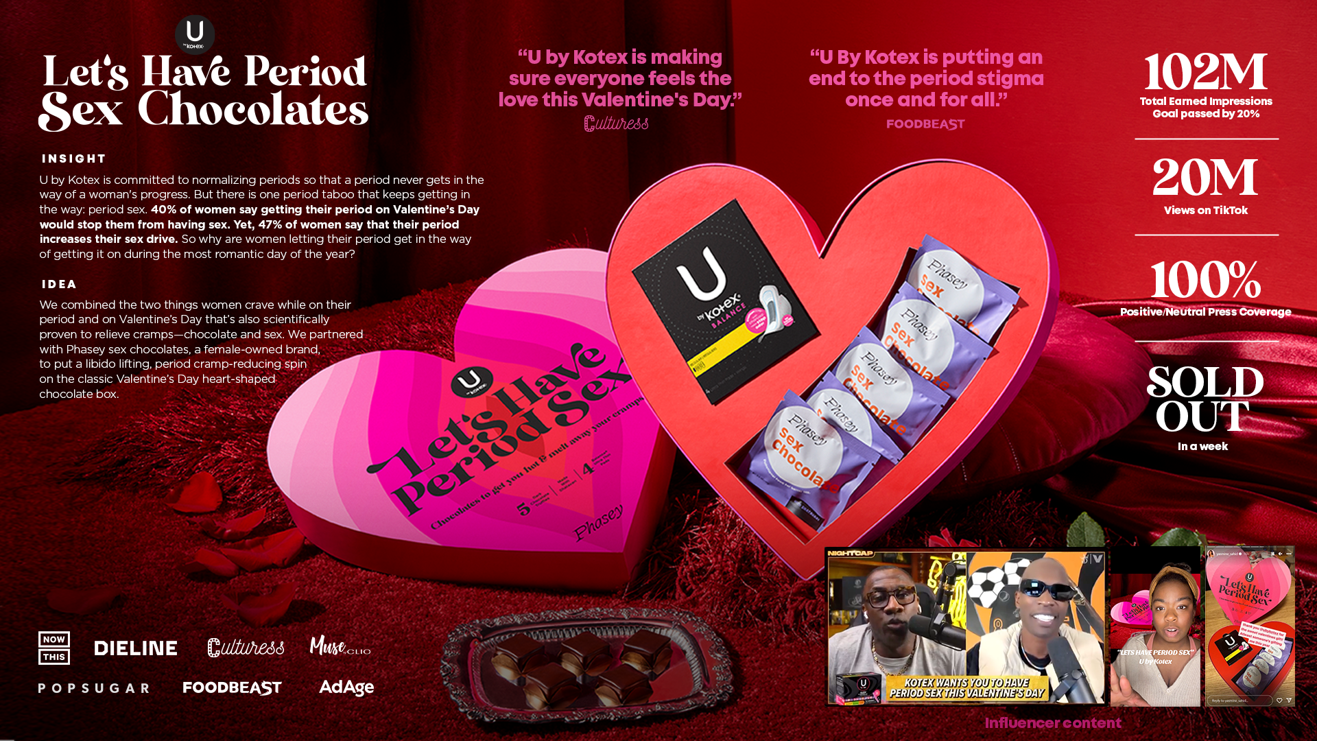 U by kotex believes a period should never get in the way of a woman's progress. But for 40% of women on Valentine's Day, periods do get in the way of getting it on, Which is unfortunate because 47% of women say their period increases their sex drive. So to spark some conversation on this taboo subject, we combined two things women crave on their period and on V-Day—both of which are scientifically proven to reduce cramps: chocolate and sex.